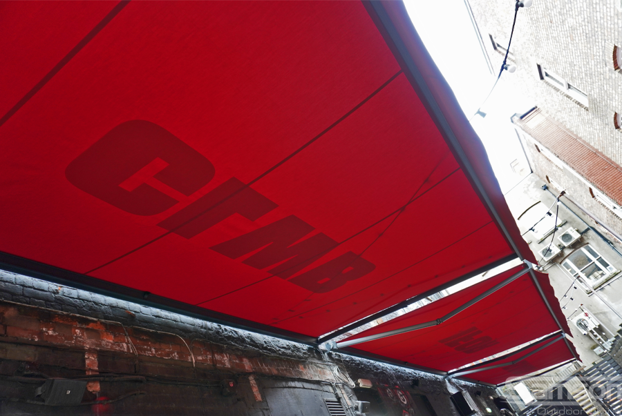 Our awnings also feature LED arm lighting to create a striking look day and night while offering practical cover for guests. To enhance the visual impact, our team customed printed fabric on both the awnings and valances which creates an eye-catching branded exterior.